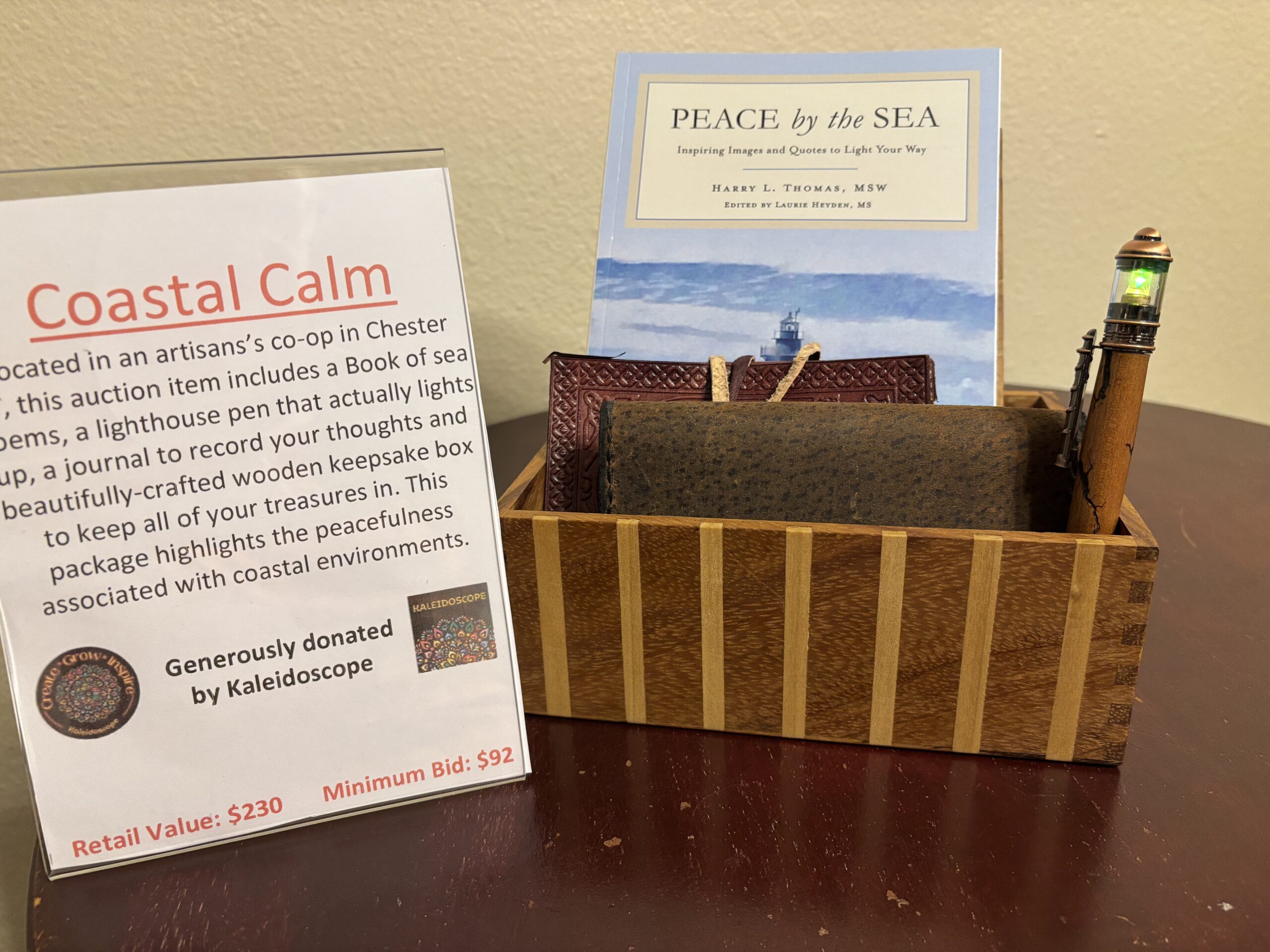 This auction item includes a book of sea poems, a lighthouse pen that actually lights up, a journal to record your thoughts, and a beautifully crafted wooden keepsake box to store all of your treasures.
