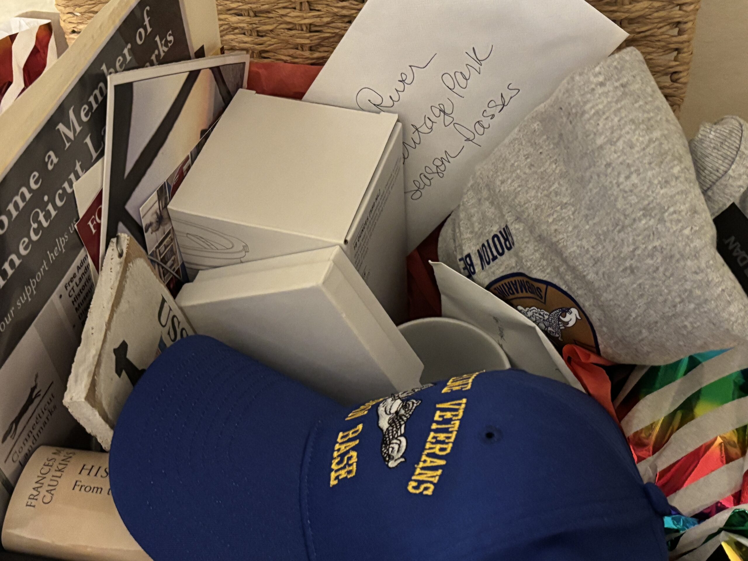 A collection of goodies from TRHP and our partners, including: Avery-Copp House: Ghosts of Groton Bank, Cedar Grove Cemetery: cemetery history booklet, Custom House Maritime Museum:mug, Lyman Allyn MuseumFamily membership, Shaw Mansion: Diary of Joshua Hempstead and The History of New London, Benedict Arnold Bobblehead and (4) tickets to 16th Annual Thames River Cruise aboard the Cecelia Ann, Submarine Force Library & Museum: 18 oz. stainless steel tumbler, The Ice Diaries and USS Nautilus longitude/latitude sign, SUBVETS Memorial: (1) ball cap, 1 Holland Club Coffee mug, (1)