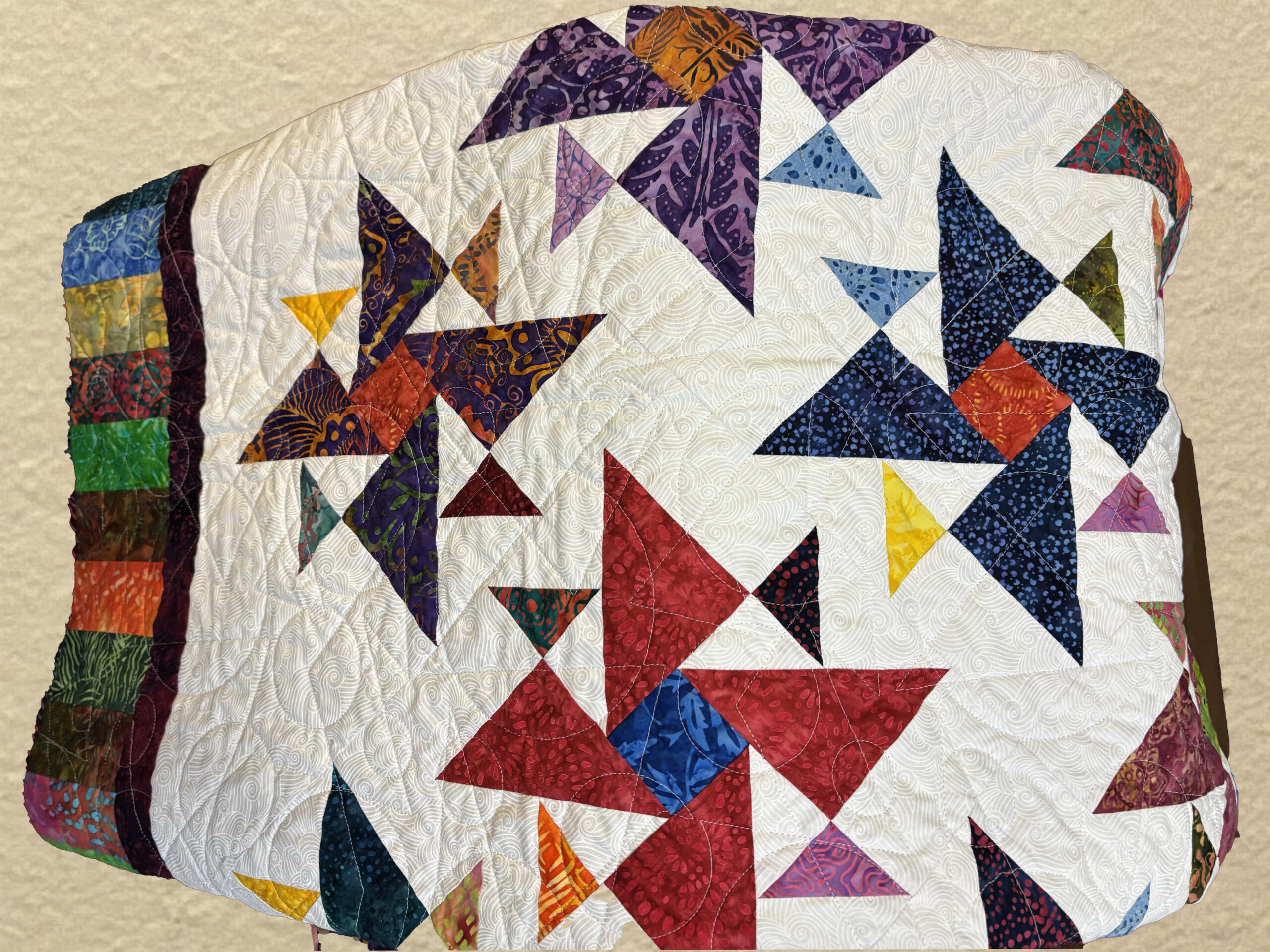"Triangles Galore", is a stunning 64 inch x 52 inch quilt hand crafted by Marian Galbraith.