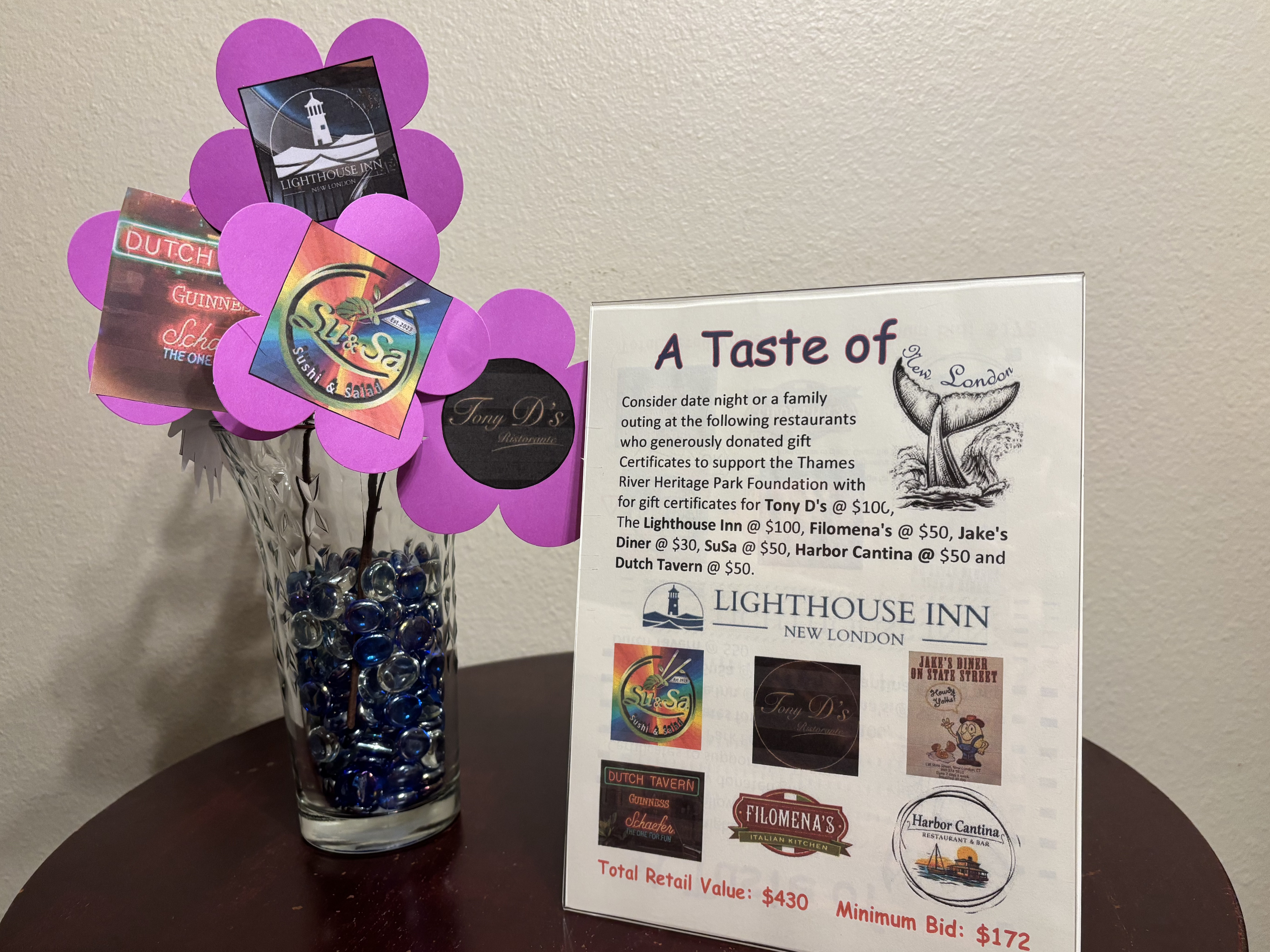 Gift certificates for Tony D's for $100, The Lighthouse Inn for $100, Filomena's for $50, Jake's Diner for $30, SuSa for $50, Harbor Cantina for $50, and Dutch Tavern for $50.