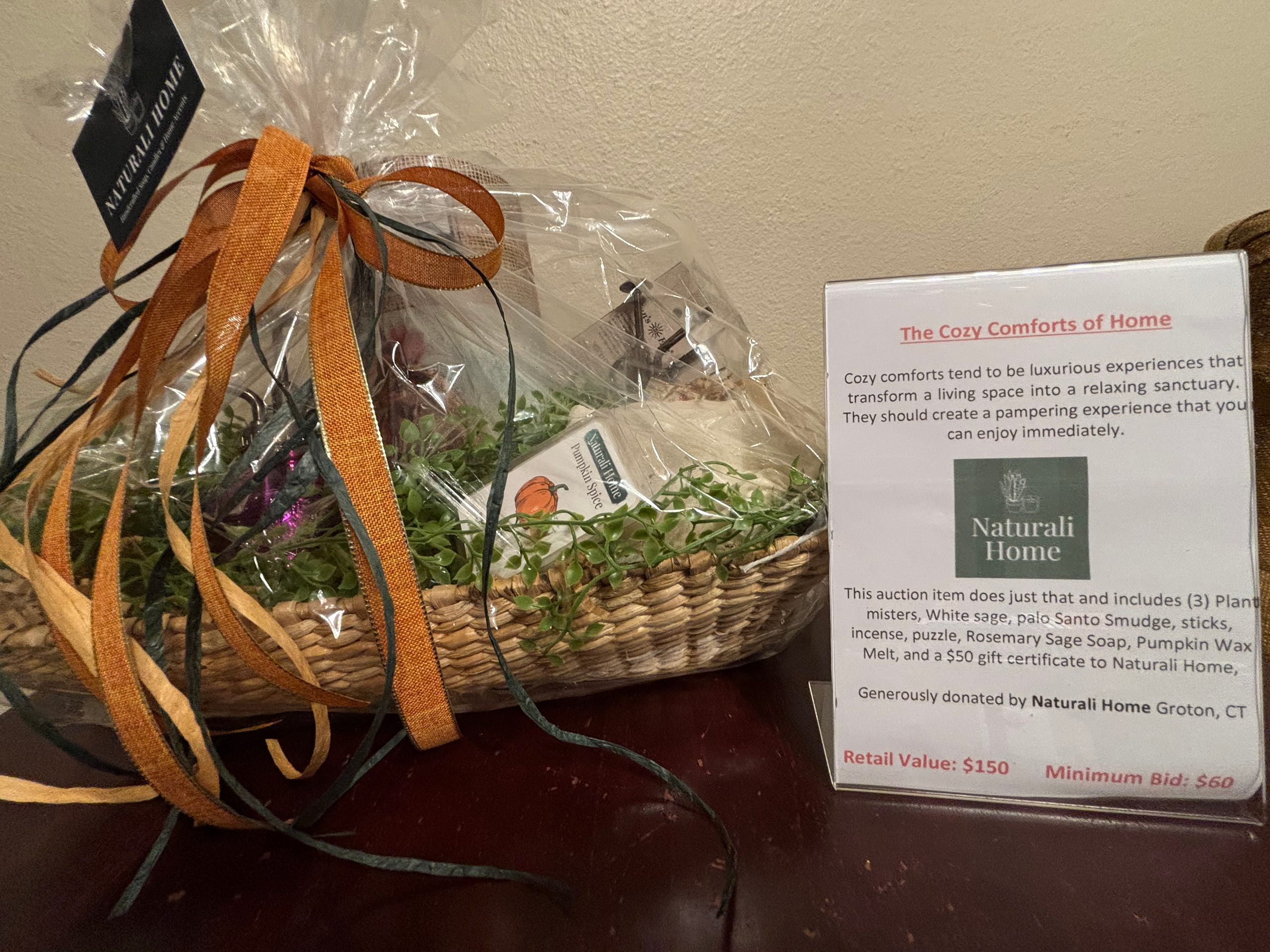 This auction item includes (3) plant misters, white sage, palo santo smudge sticks, incense, puzzle, rosemary sage soap, pumpkin wax melt, and a $50 gift certificate to Naturali Home.
