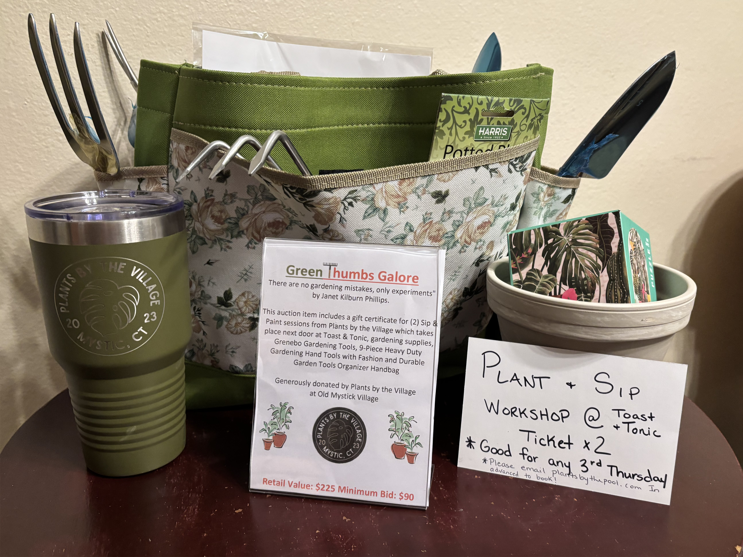This auction item includes a gift certificate for 2 Sip & Paint sessions from Plants by the Village, which takes place next door at Toast & Tonic, gardening supplies, Grenebo gardening tools, and a 9-piece heavy-duty gardening hand tools set with a fashionable and durable garden tools organizer handbag.
