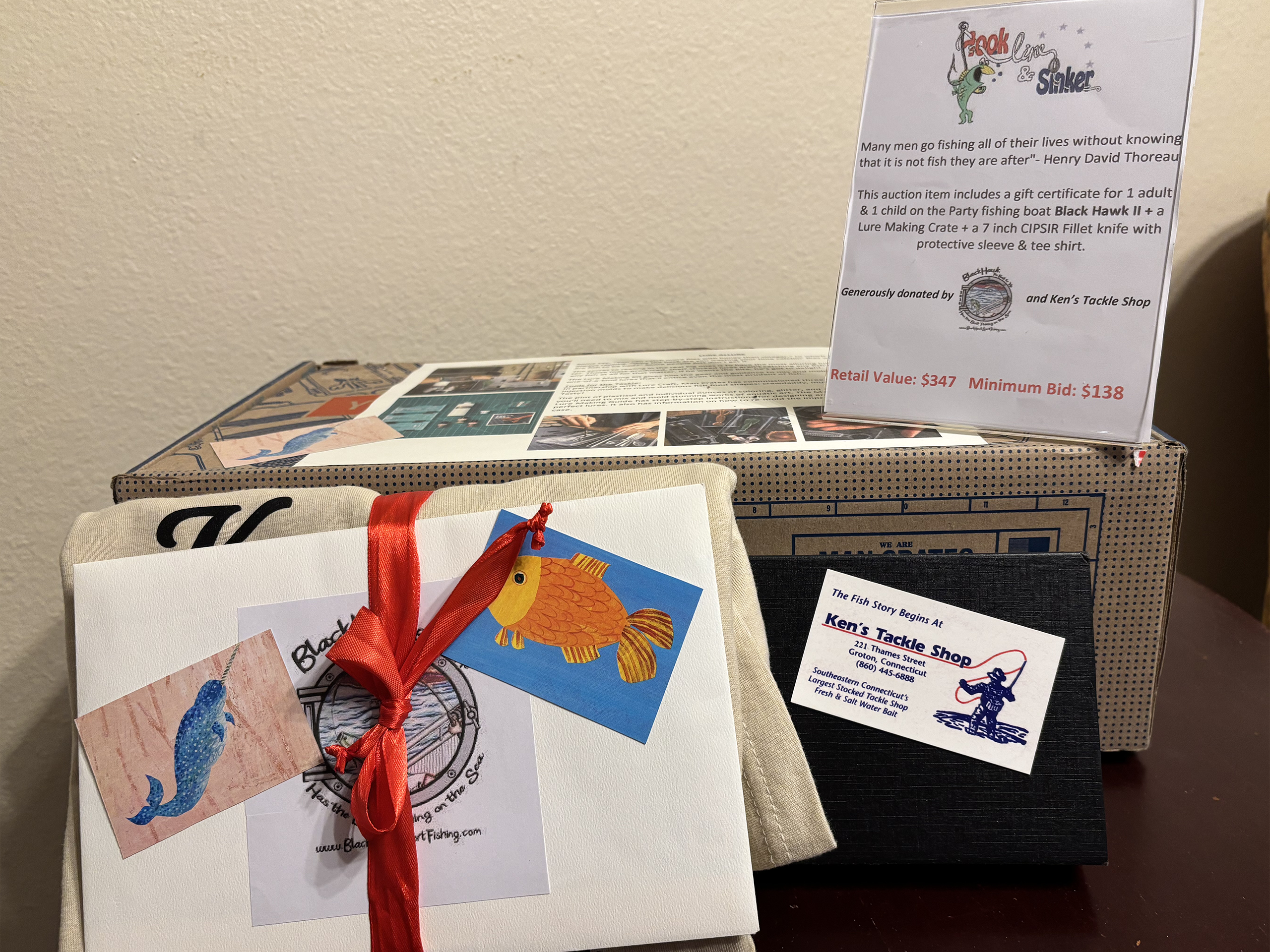 This auction item includes a gift certificate for 1 adult and 1 child on the party fishing boat Black Hawk II, a lure making crate, a 7-inch CIPSIR fillet knife with protective sleeve, and a tee shirt.