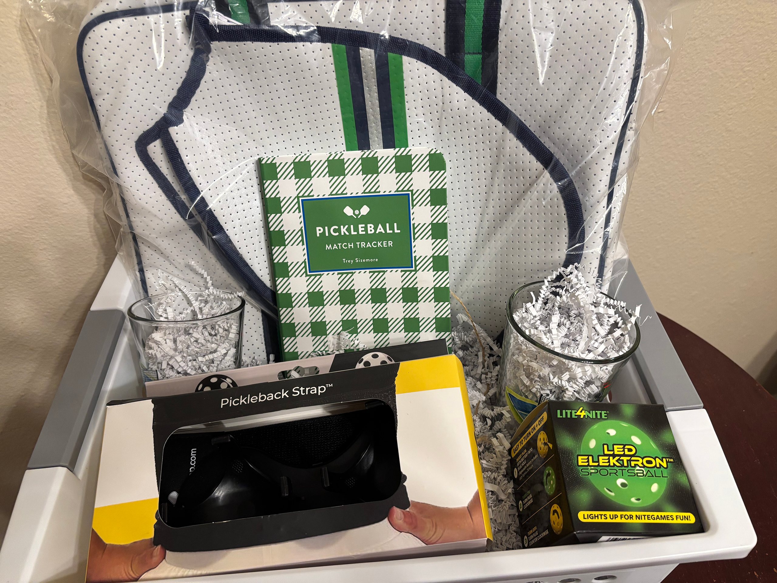 This auction item is a great way to get in on the craze and includes a 2-in-1 Pickleball Paddle Tote Bag in white and green, a Wearable Pickleball Strap, a Pickleball Match Tracker, a Glow-in-the-dark pickleball, and 2 Pickles playing Pickleball pint glasses.