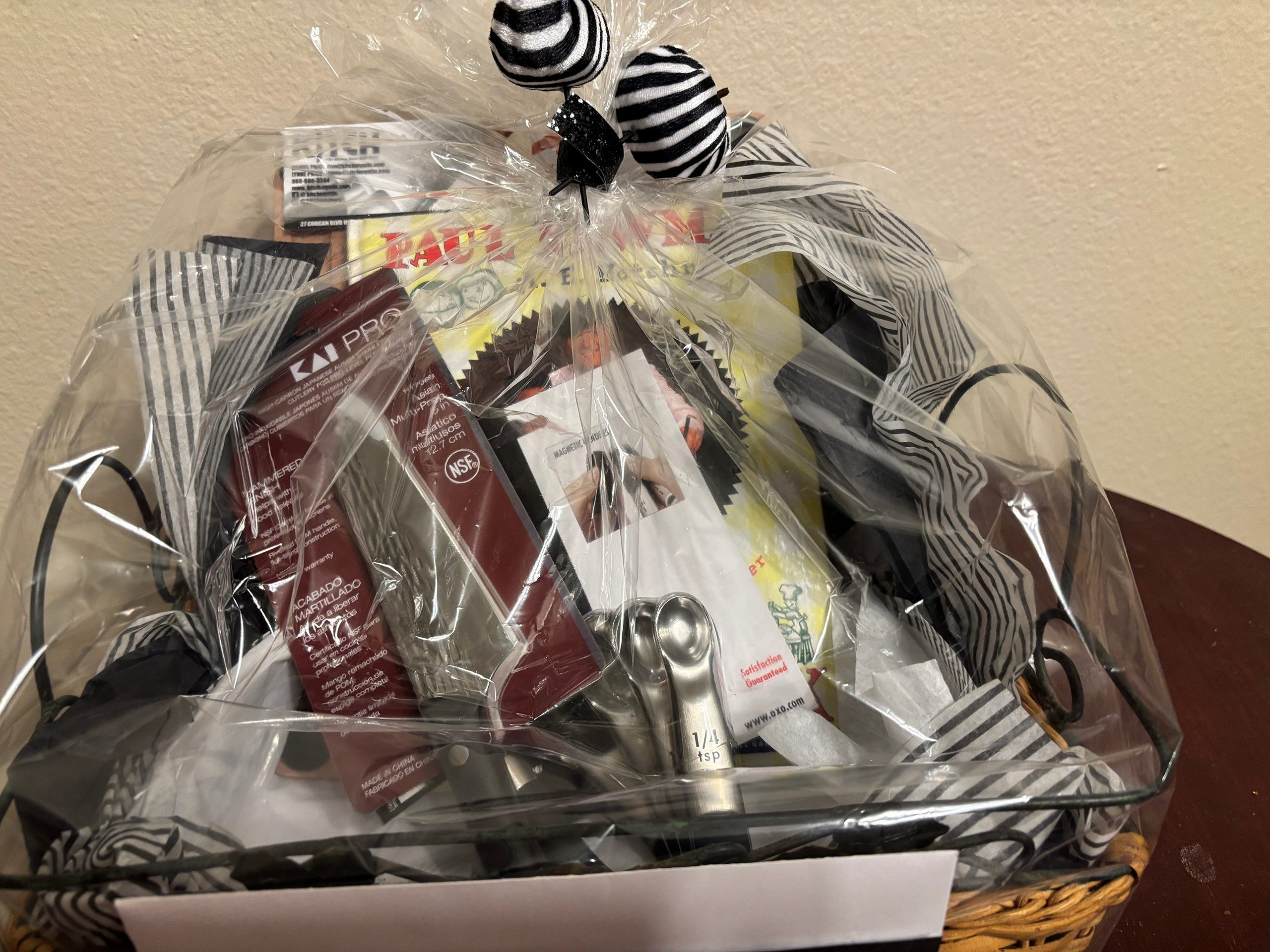 This auction item includes a gift certificate for two (2) cooking classes, a knife, measuring spoons, a whisk, a cookbook, and a cutting board.