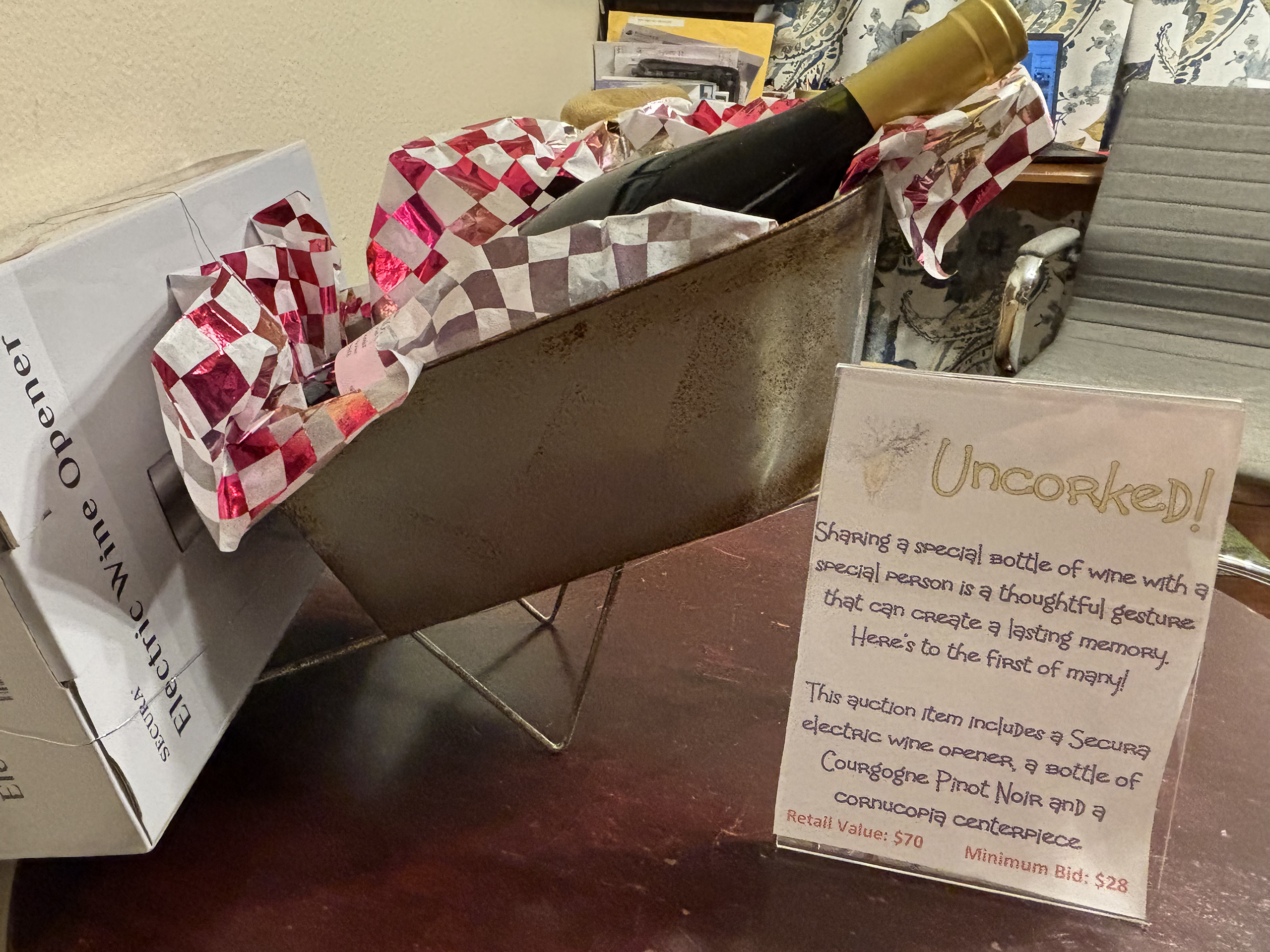 This auction item includes a Secura Electric wine opener, a bottle of Bourgogne Pinot Noir and a cornucopia centerpiece.